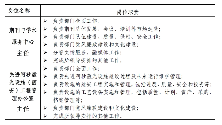 中国科学院西安光机所支撑部门负责人招聘启事正文根据工作需要,经所务会研究,现决定面向西安分院系统单位和本所正式在册职工,招聘期刊与学术服务中心和先进阿秒激光设施(西安)工程管理办公室主任。现将招聘岗位、任职基本条件与资格和应聘程序通知如下。
